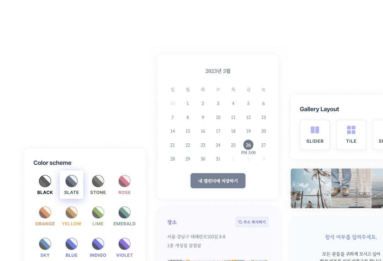 RSVP, 캘린더, 지도, 방명록 등 원하는 기능만 골라 우리만의 청첩장을 만들어 보세요.